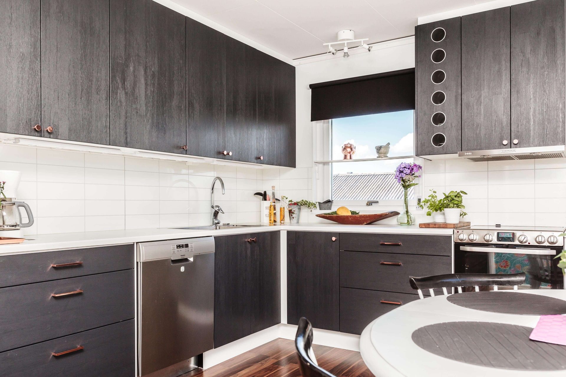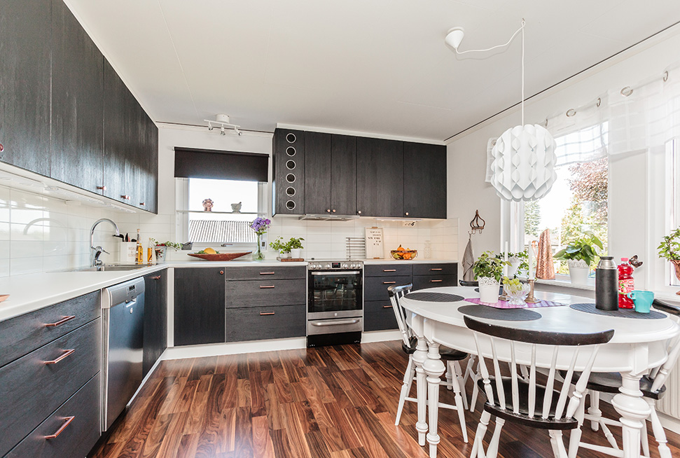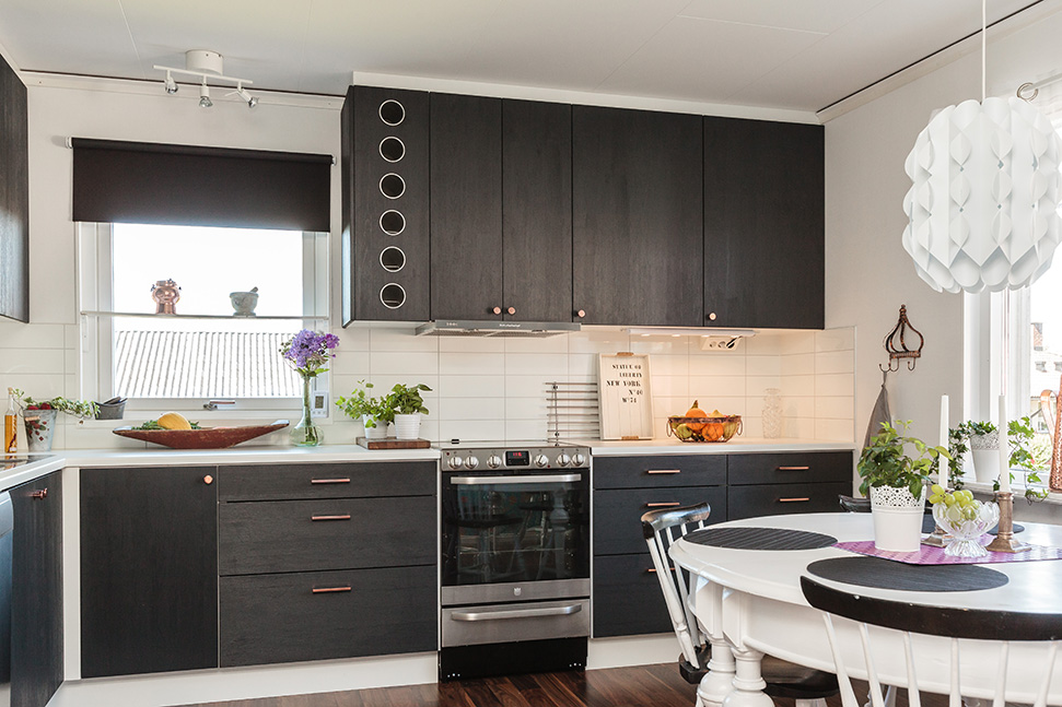 Resultatet var bedre enn de noen gang hadde forestilt seg. Et helt nytt kjøkken med nye praktiske funksjoner og mange skuffer med god lagring. Valget falt på en av Herjedalskjøkkens nyhet, kjøkkenfrontene Tjæra, et mørkt kjøkkenskap med stramme linjer og tydelig trekonstruksjon. Hvite kjøkkendører ville de definitivt ikke ha.