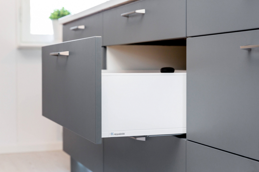 – Å bruke to forskjellige leverandører til kjøkkenet har fungert bedre enn vi først trodde. Funksjonene er ikke skrogene, så det var ikke noe problem å bestille dem fra en annen leverandør. Det viktigste for oss var god kvalitet på kjøkkenskap og skuffer. Vi ønsket oss et varig kjøkken som holder lenge.