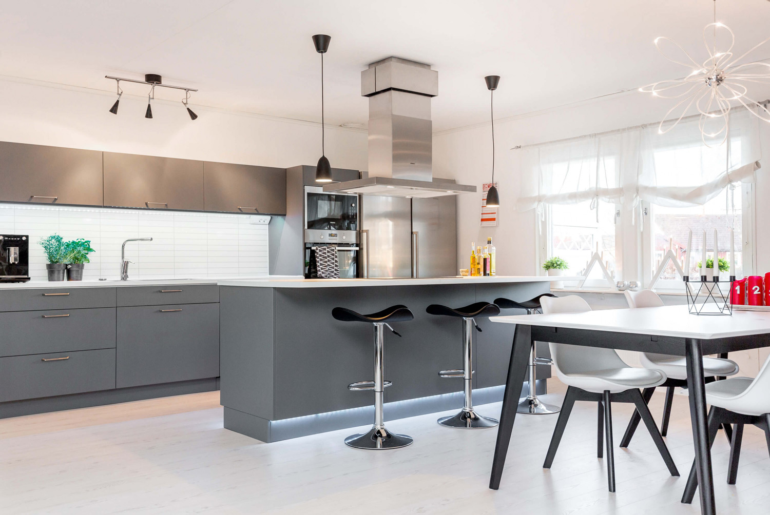 Familien valgte den grå fargen Åska på Slett R3 kjøkkenfronter, en enkel og moderne rettkantet front, sammen med Eka håndtakene som gir et ryddig uttrykk. De grå kjøkkenskapene står også godt i stil med det ellers friske og lyse kjøkkenet.