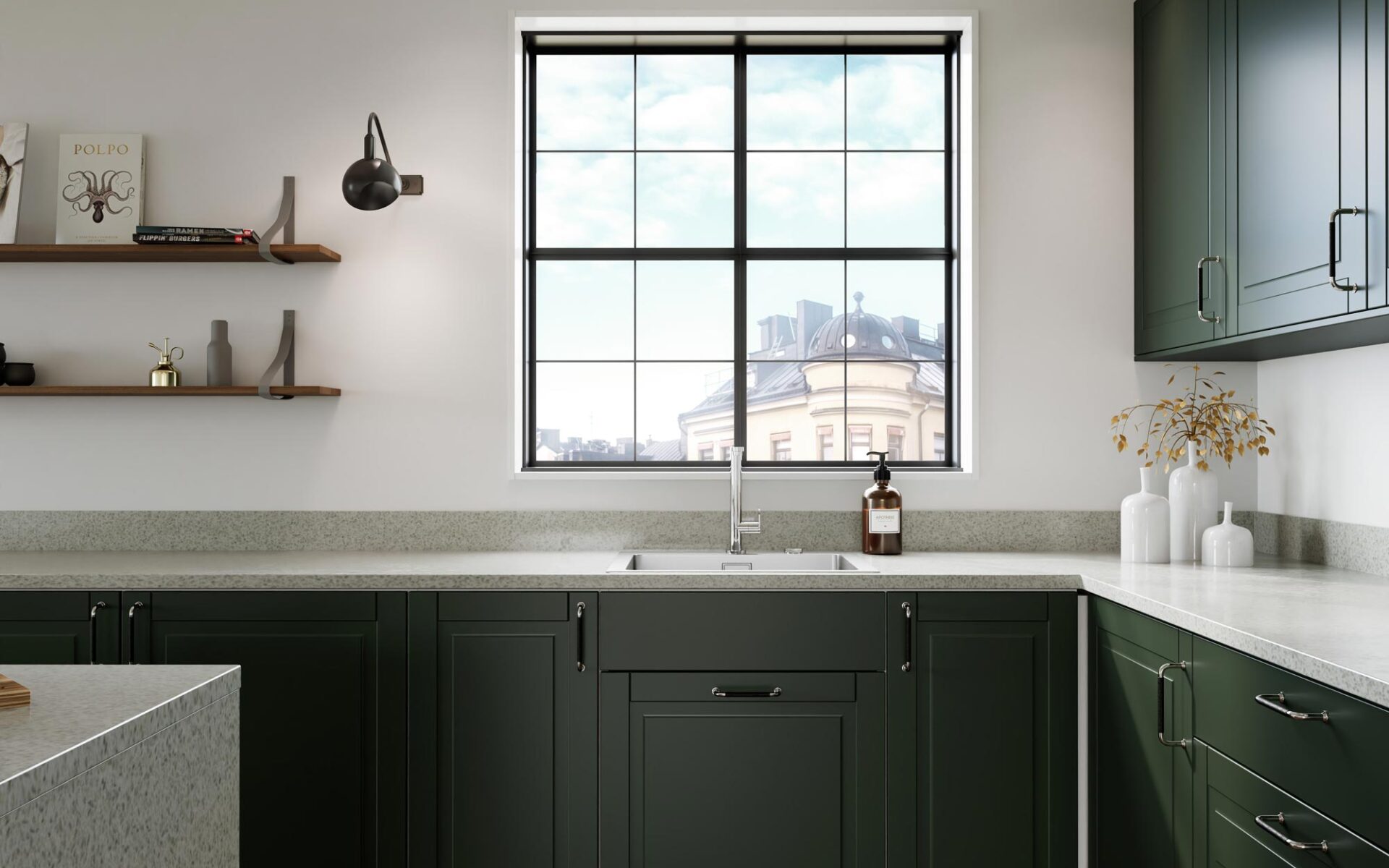 Slett R3 kjøkkenfronter i fargen skogmossa med Raja Black kjøkkenbenk.