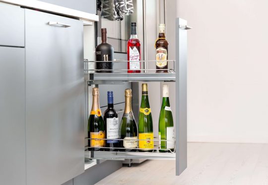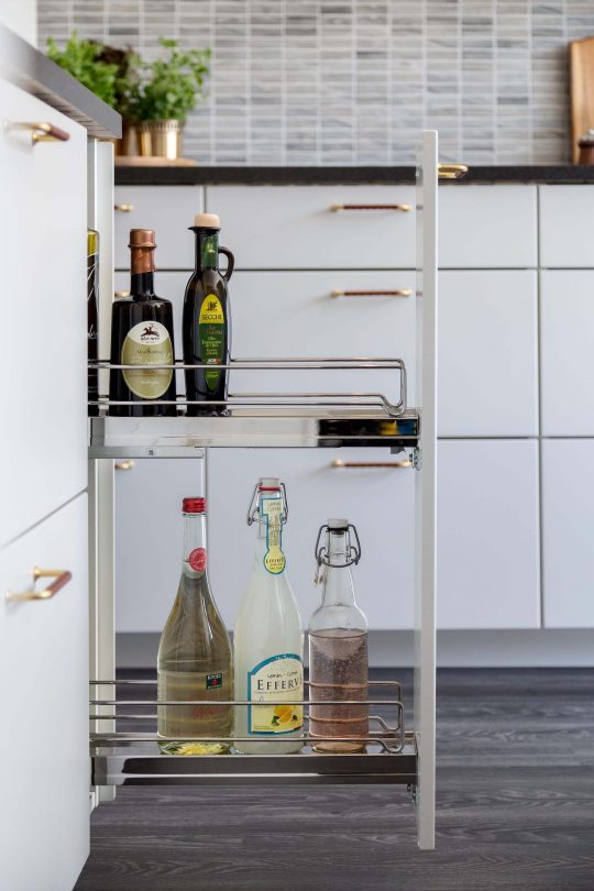 Gjem olje, eddik og soyasaus på ett sted. Trekk ut skuffen når du trenger dem. Et praktisk flaskeutdrag.