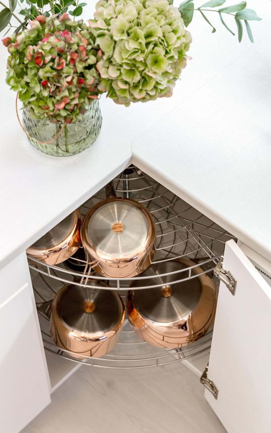 En større karusell for å lett kunne komme til det som ligger i skapet, som panner og redskaper.