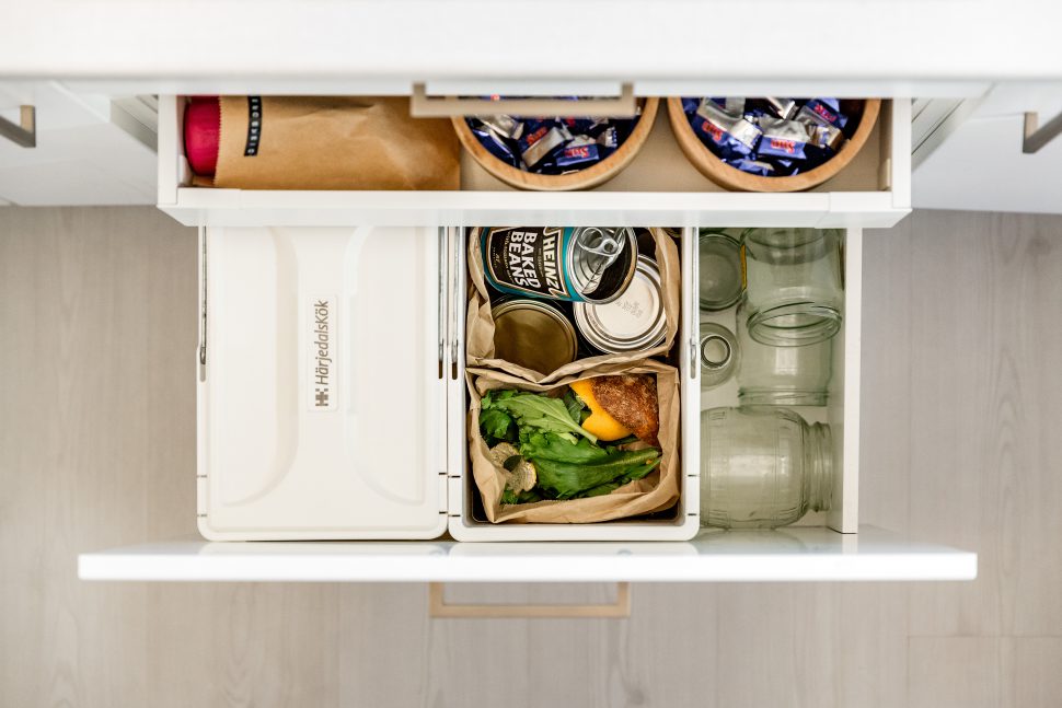 En stasjon for avfallssortering. Alt får sin plass og det er enkelt å holde system. Passer fint til uttrekk-skuff under vask.